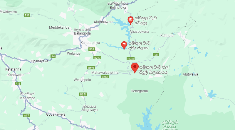 Samanalawewa Power Station is located at Kapugala which is about 160km southeast of Colombo east of the town of Balangoda. Samanalawewa reservior and dam is located on the Walawe Ganga immediately downstream of the confluence with the Belihul Oya and immediately upstream of the Matihakke Ara.